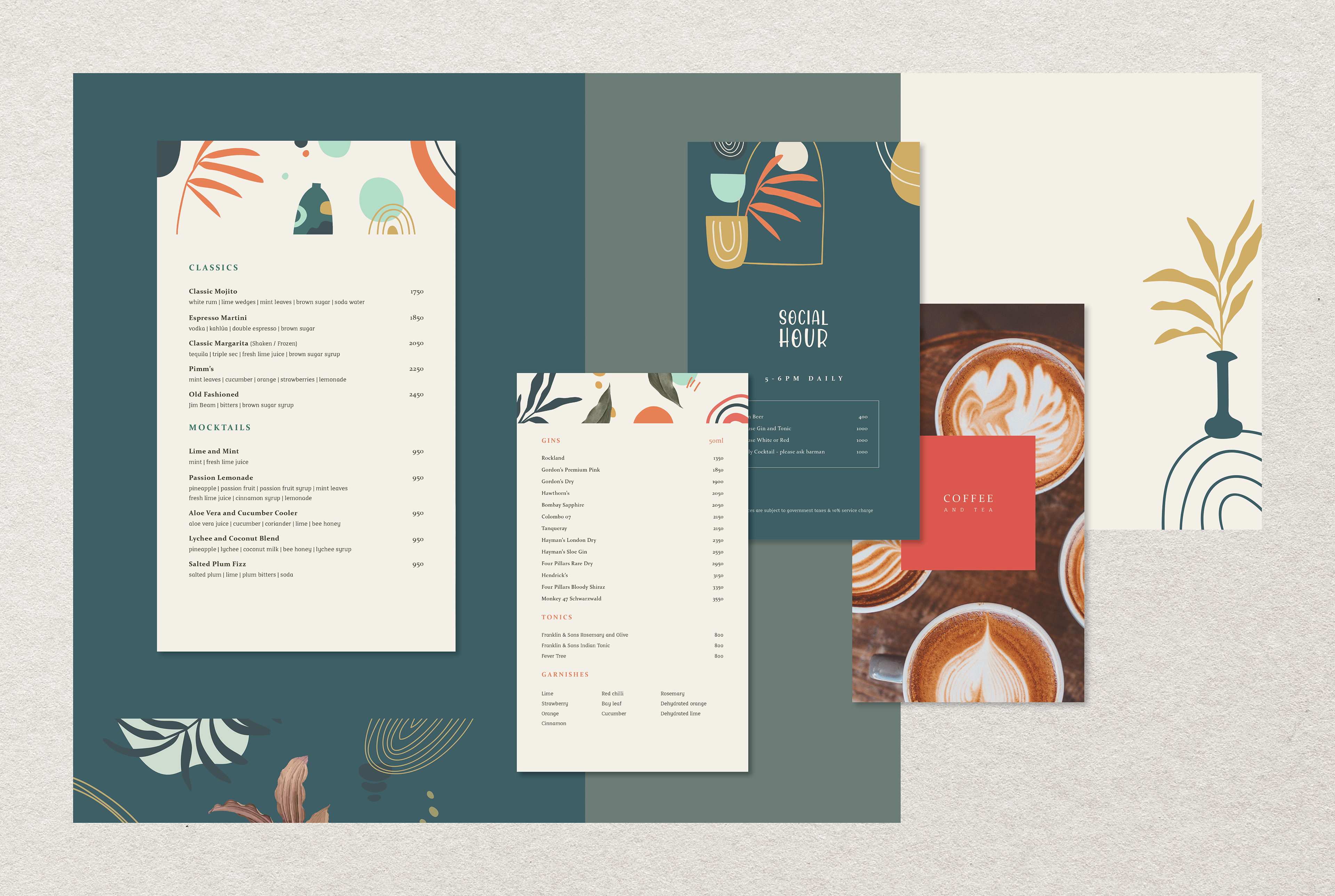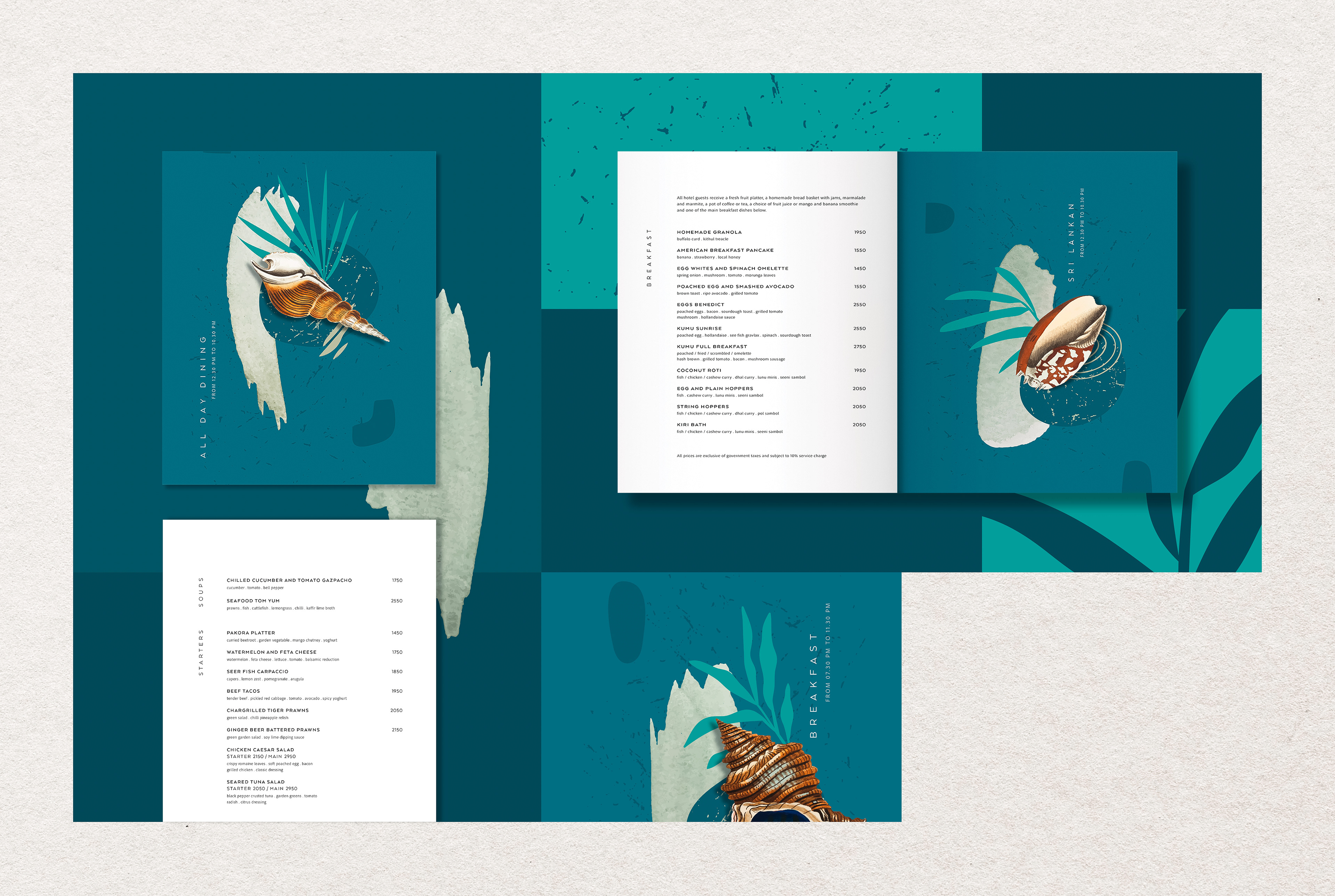 A curated selection of menus designed for Teardrop Hotels, including Kumu Beach, Fort Bazaar, each crafted to reflect the ambience of its location.