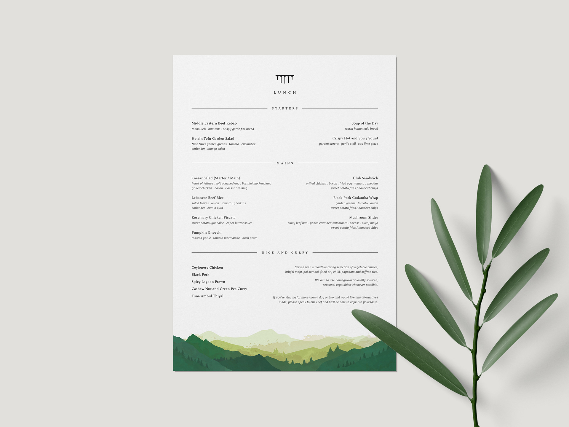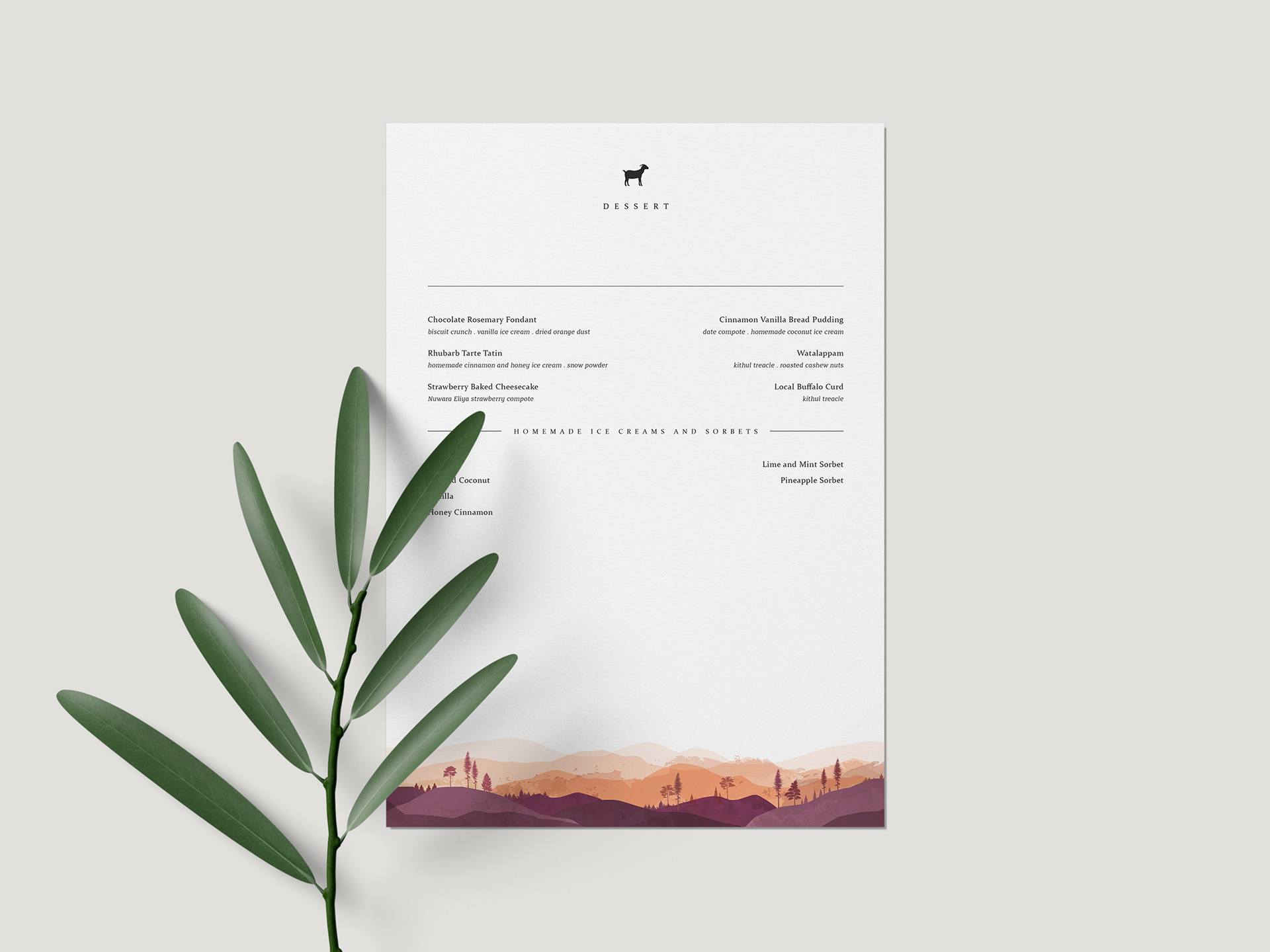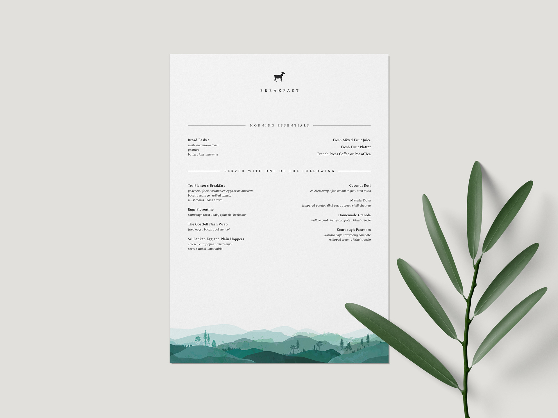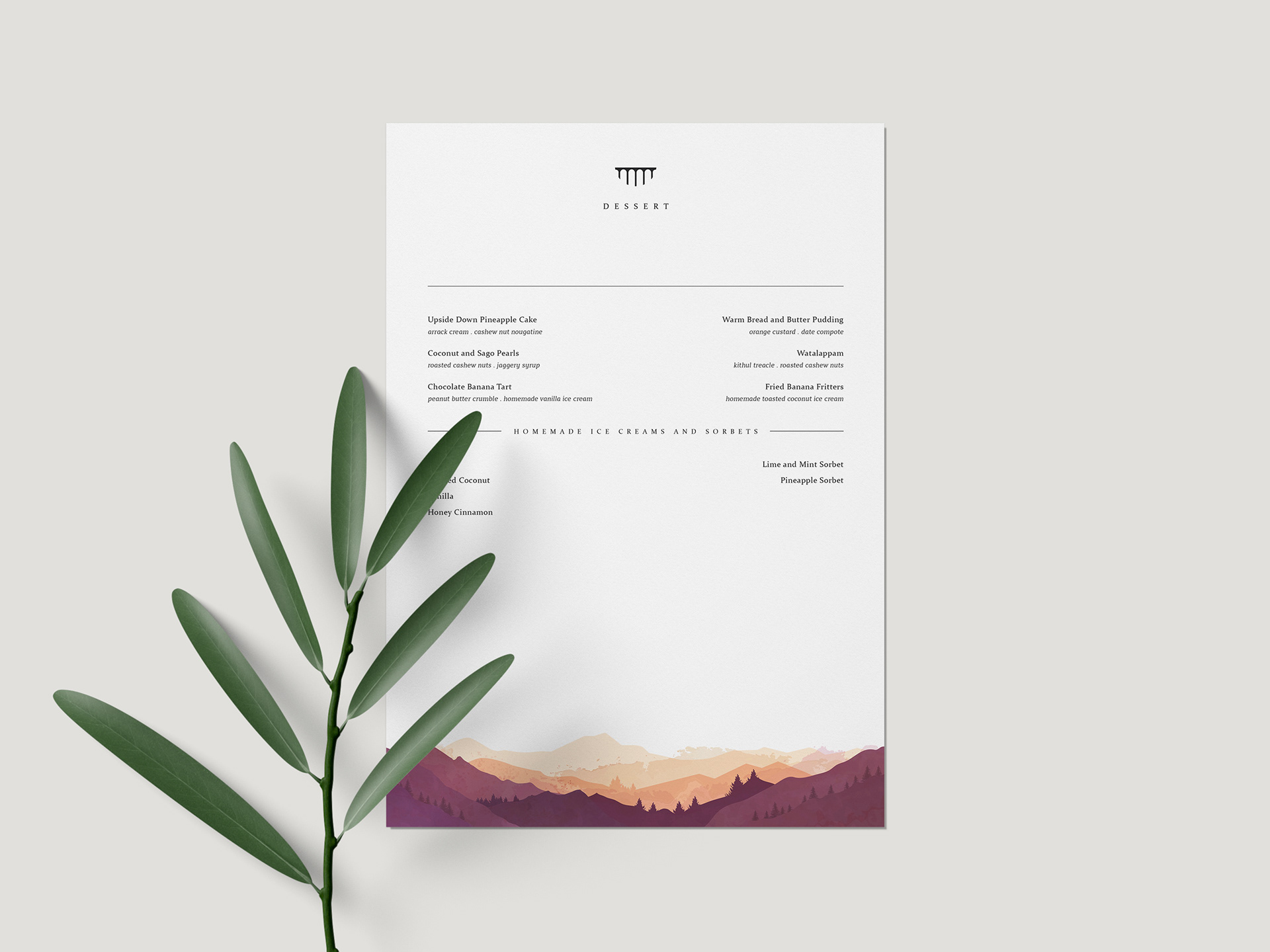 A collection of menu designs created for Teardrop Hotels’ hill retreats, capturing the calm, refined spirit of the highlands through shades, with each bungalow reflecting the beauty of its surroundings.